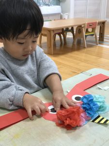 花紙をくしゃくしゃくしゃっとしたり、クレヨンで目を描いたり、のりづけをしました。